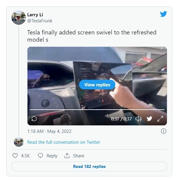 在对他最初的推文的回复中,李确认,旋转显示屏不是售后改装,而是 "来自特斯拉工厂",视频中的Model S于4月29日交付。特斯拉播客Ride the Lightning的主持人Ryan McCaffrey最近在推特上说,从特斯拉工厂下线的最新Model S和Model X汽车都配备了支持这一功能的硬件。如果幸运的话,这应该意味着旋转屏幕即将成为未来Model S和Model X特斯拉的标准配置。